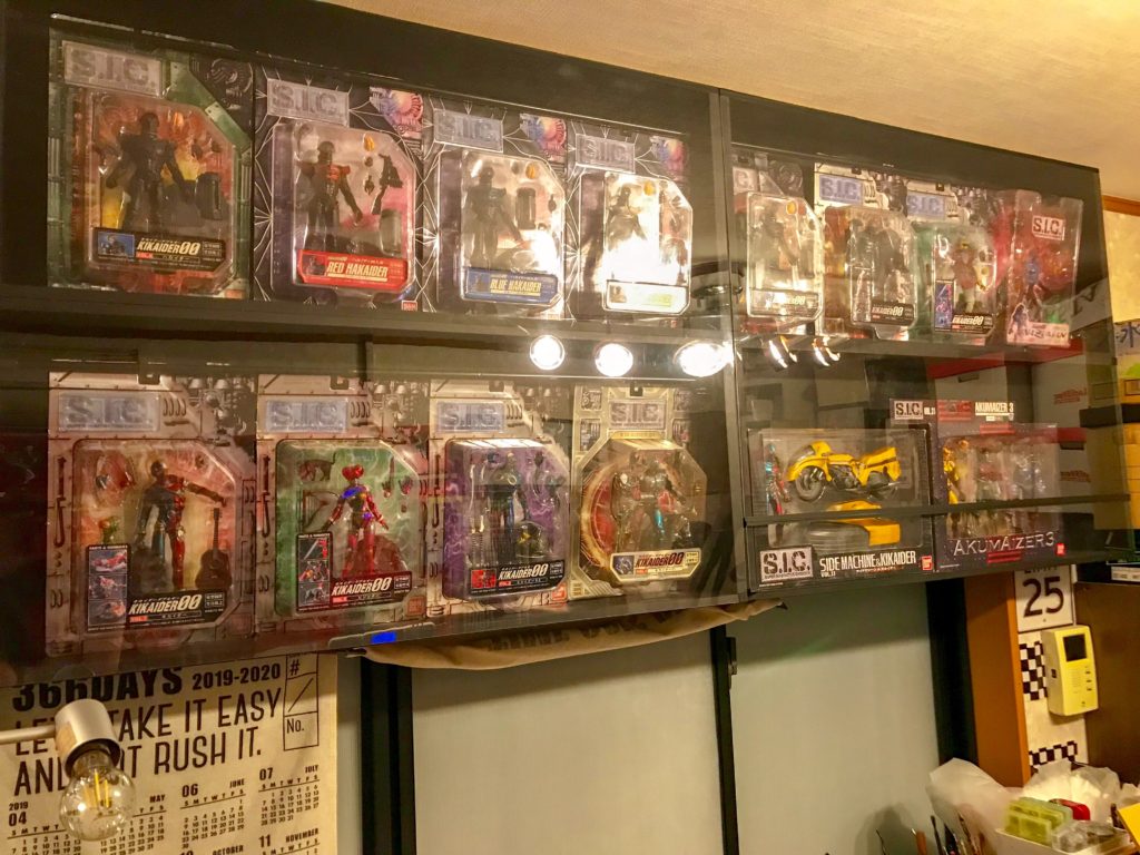 デスク前の窓の上部に自作した、S.I.C.のハカイダーをブリスターパックに入れたまま飾る用のラック。